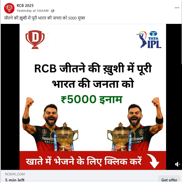 फेसबुक पर RCB 2025 नाम के पेज पर स्कैम लिंक के साथ एक वीडियो शेयर किया गया है. वीडियो में एक ग्राफिक पोस्टर है जिसमें लिखा है, 'आरसीबी के जीतने की खुशी में पूरे भारत की जनता को 5000 रुपये का इनाम, पैसे भेजने के लिए क्लिक करें.' वीडियो के एक साथ वॉइस ओवर भी जुड़ा है.
