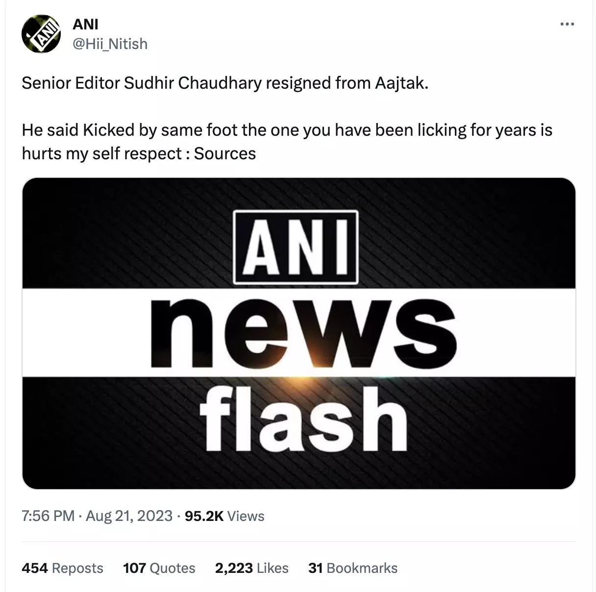 सोशल मीडिया पर टीवी टुडे नेटवर्क के कंसल्टिंग एडिटर और आजतक के एंकर सुधीर चौधरी को लेकर एक दावा काफ़ी वायरल हो रहा है. वायरल दावे को समाचार एजेंसी एएनआई के नाम से बने एक कथित X (पूर्व में ट्विटर) हैंडल ने शेयर किया है, जिसमें लिखा हुआ है "सुधीर चौधरी ने आजतक से इस्तीफ़ा दे दिया है".
