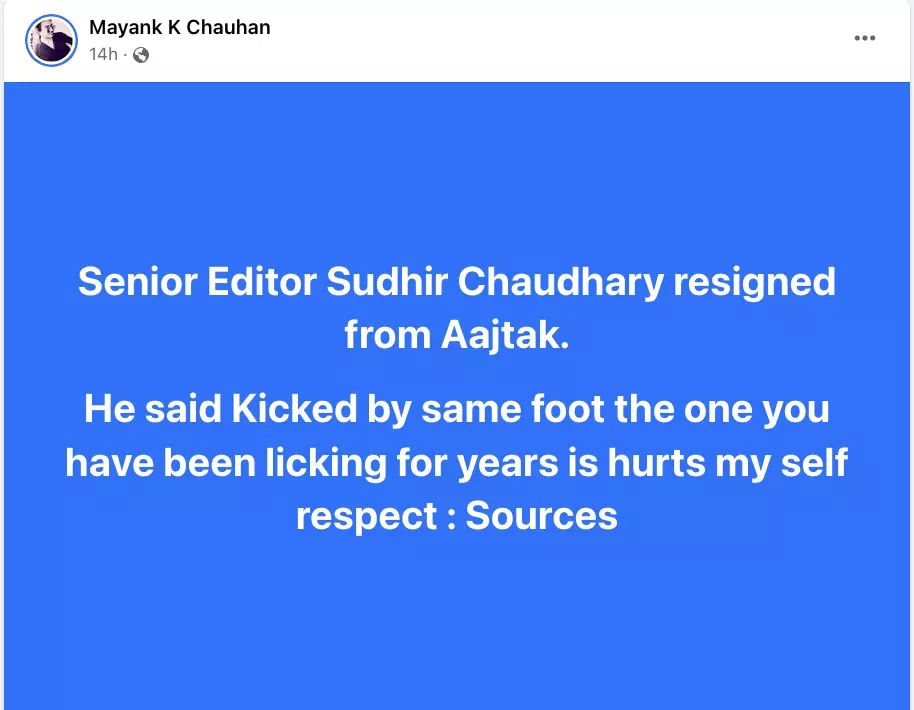 एएनआई के पैरोडी अकाउंट से वायरल दावे को अंग्रेज़ी कैप्शन के साथ शेयर किया गया है, जिसका हिंदी अनुवाद है “वरिष्ठ संपादक सुधीर चौधरी ने आजतक से इस्तीफा दे दिया. उन्होंने कहा कि जिसकी आप वर्षों से चापलूसी कर रहे हैं, उसी के द्वारा धिक्कार मिलना मेरे स्वाभिमान को ठेस पहुंचाता है: सूत्र”.