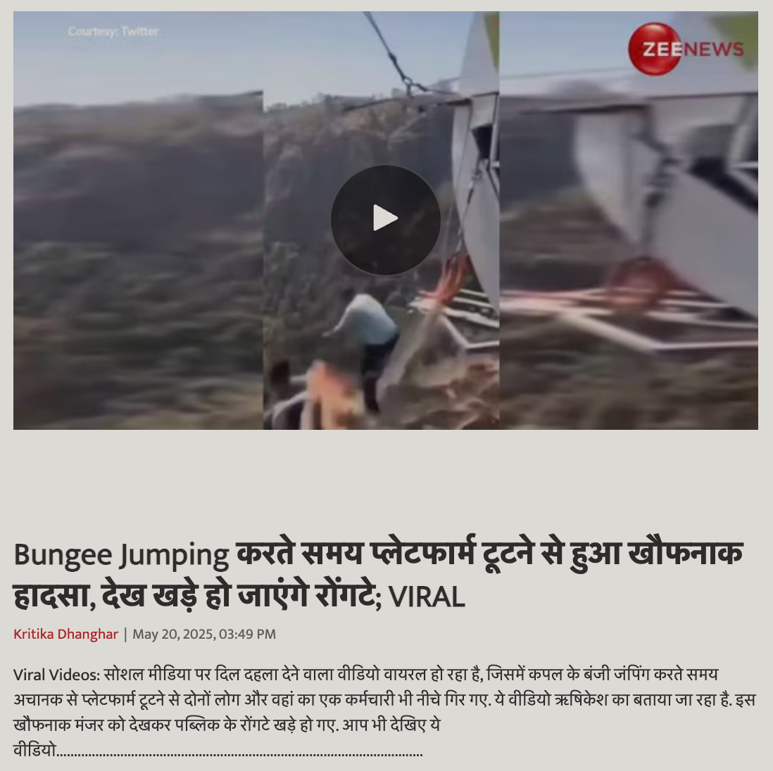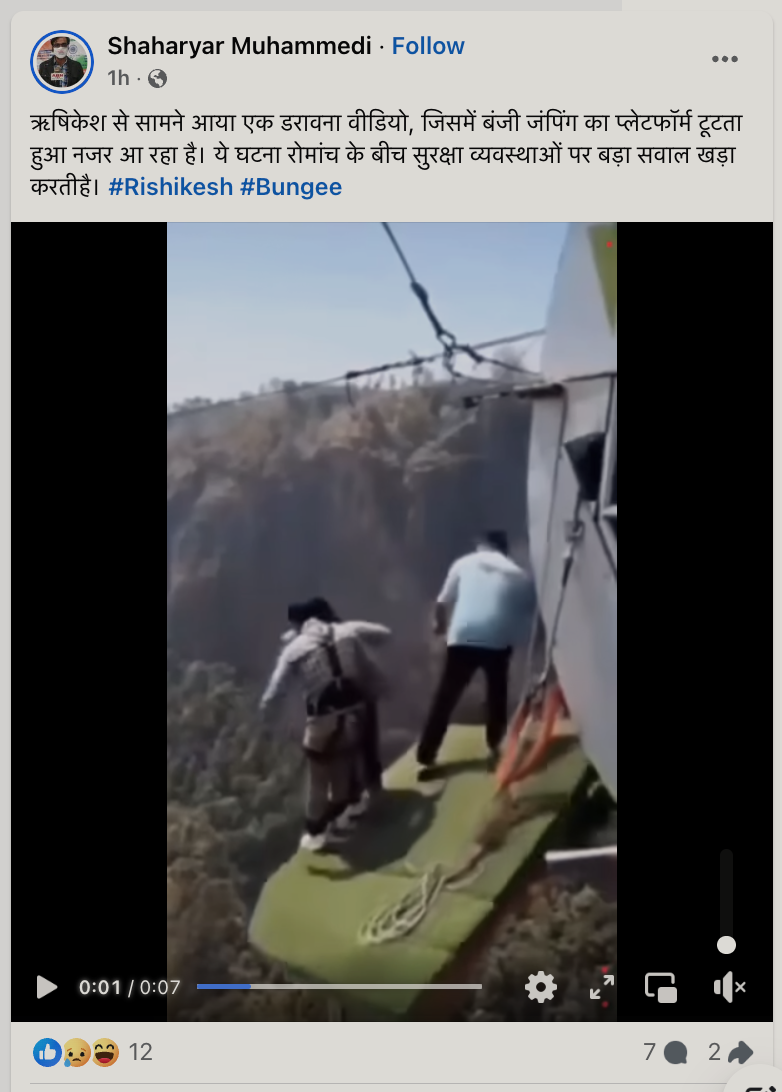 फेसबुक पर एक यूजर ने इस वीडियो को शेयर करते हुए लिखा, 'ऋषिकेश से सामने आया एक डरावना वीडियो, जिसमें बंजी जंपिंग का प्लेटफॉर्म टूटता हुआ नजर आ रहा है. ये घटना रोमांच के बीच सुरक्षा व्यवस्थाओं पर बड़ा सवाल खड़ा करती है.'