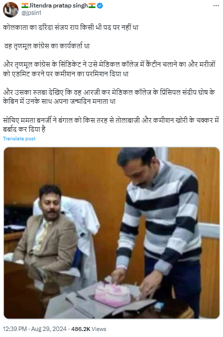 जितेंद्र ने आगे लिखा, 'इसका रुतबा देखिए कि वह आरजी कर मेडिकल कॉलेज के प्रिंसिपल संदीप घोष के केबिन में उनके साथ अपना जन्मदिन मनाता था. सोचिए ममता बनर्जी ने बंगाल को किस तरह से तोलाबाजी और कमीशन खोरी के चक्कर में बर्बाद कर दिया है.'