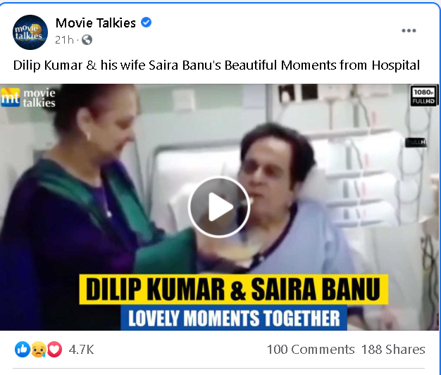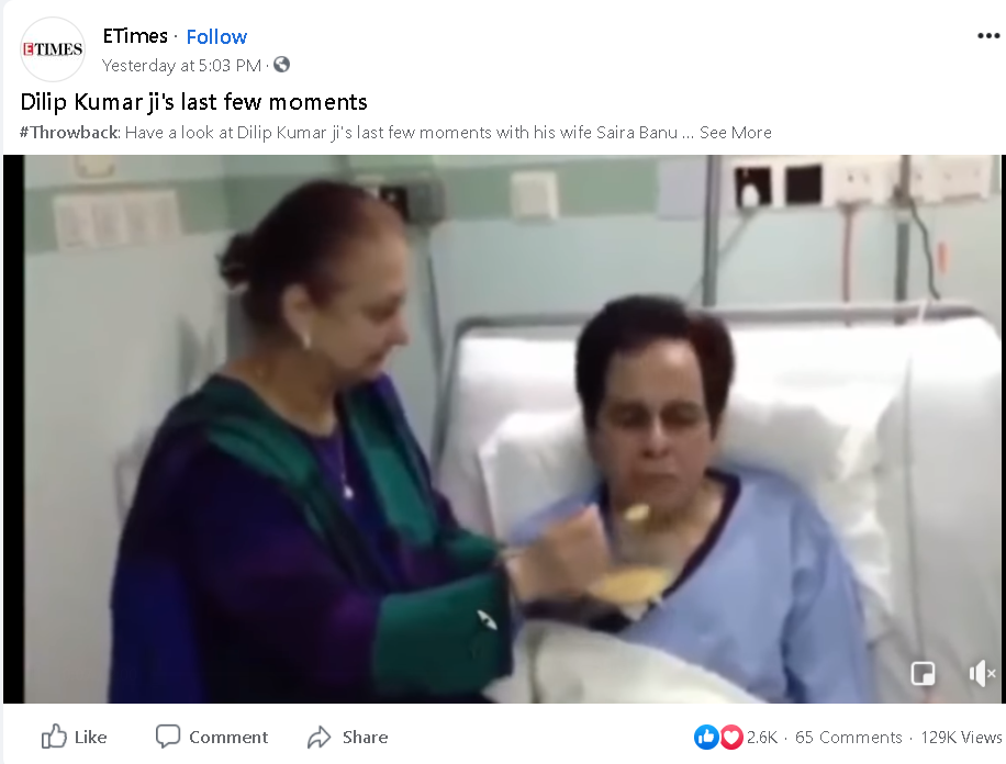 दिलीप कुमार की मृत्यु के बाद सोशल मीडिया पर उन्हें श्रद्धांजलि देने वालों की बाढ़ सी आ गई. लेकिन इसी बीच एक वीडियो भी सोशल मीडिया पर वायरल हुआ जिसके साथ ये दावा किया गया कि वो मृत्यु से पहले हॉस्पिटल में दिलीप कुमार का उनकी पत्नी सायरा बानो के साथ आख़िरी वीडियो है. वीडियो में दिलीप कुमार हॉस्पिटल बेड पर लेटे हुए दिख रहे हैं और बग़ल में उनकी पत्नी सायरा बानो भी खड़ी हैं. वायरल वीडियो को शेयर करते हुए कैप्शन दिया गया कि ' दिलीप कुमार और उनकी पत्नी का हॉस्पिटल में आख़िरी वीडियो कितना सुंदर दृश्य है'