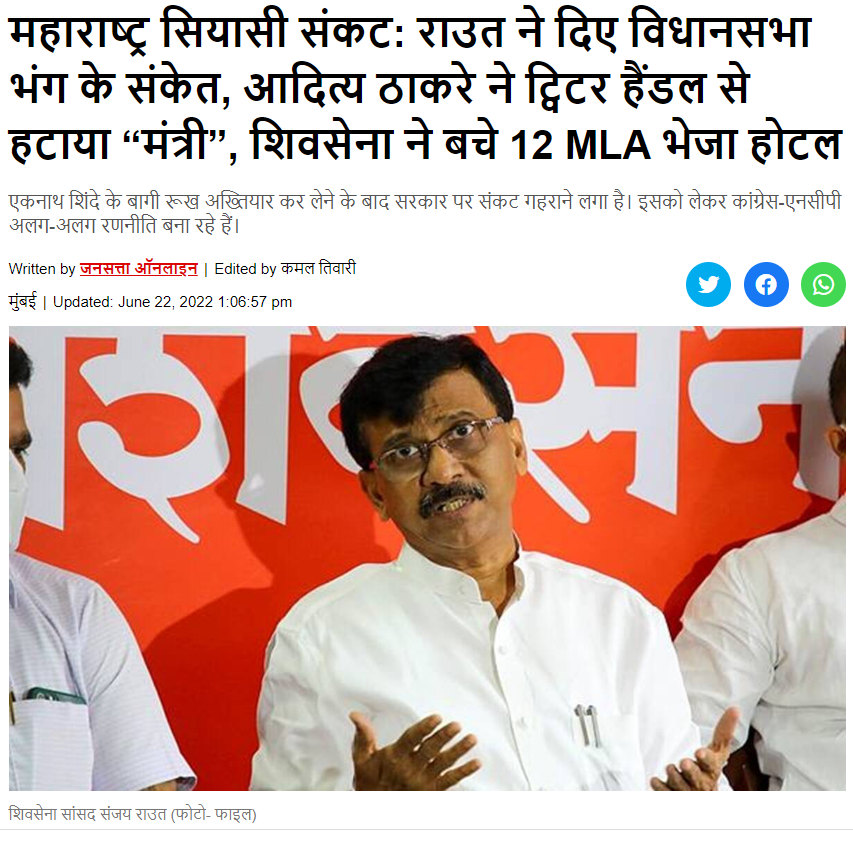 जनसत्ता ने 'राउत ने दिए विधानसभा भंग के संकेत, आदित्य ठाकरे ने ट्विटर हैंडल से हटाया "मंत्री", शिवसेना ने बचे 12 MLA भेजा होटल' हेडलाइन से ज़ारी किए गए न्यूज़ रिपोर्ट में लिखा है कि महाराष्ट्र सरकार में मंत्री आदित्य ठाकरे ने अपने ट्विटर बायो से मंत्री' शब्द हटाकर अटकलों को और भी हवा दे दी है.