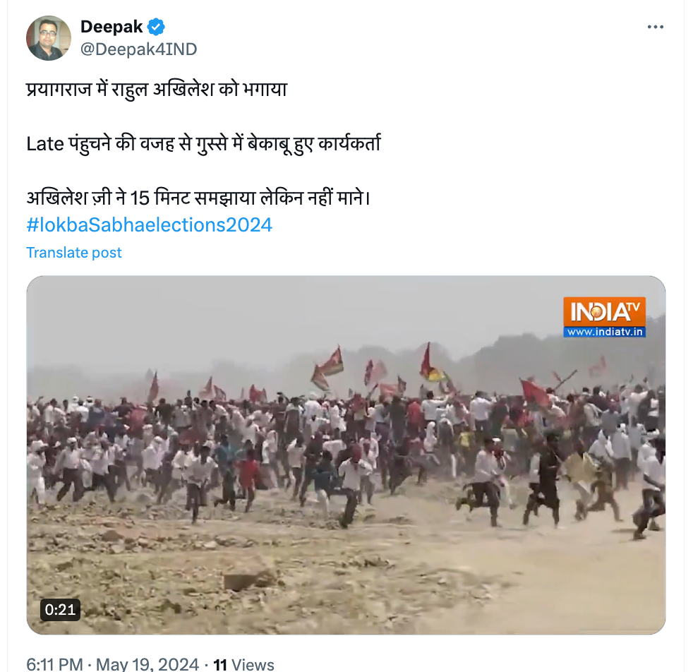 एक एक्स यूजर ने #LokbaSabhaelections2024 हैशटैग के साथ वीडियो पोस्ट करते हुए लिखा, 'प्रयागराज में राहुल अखिलेश को भगाया, लेट पंहुचने की वजह से गुस्से में बेकाबू हुए कार्यकर्ता, अखिलेश जी ने 15 मिनट समझाया लेकिन नहीं माने.'