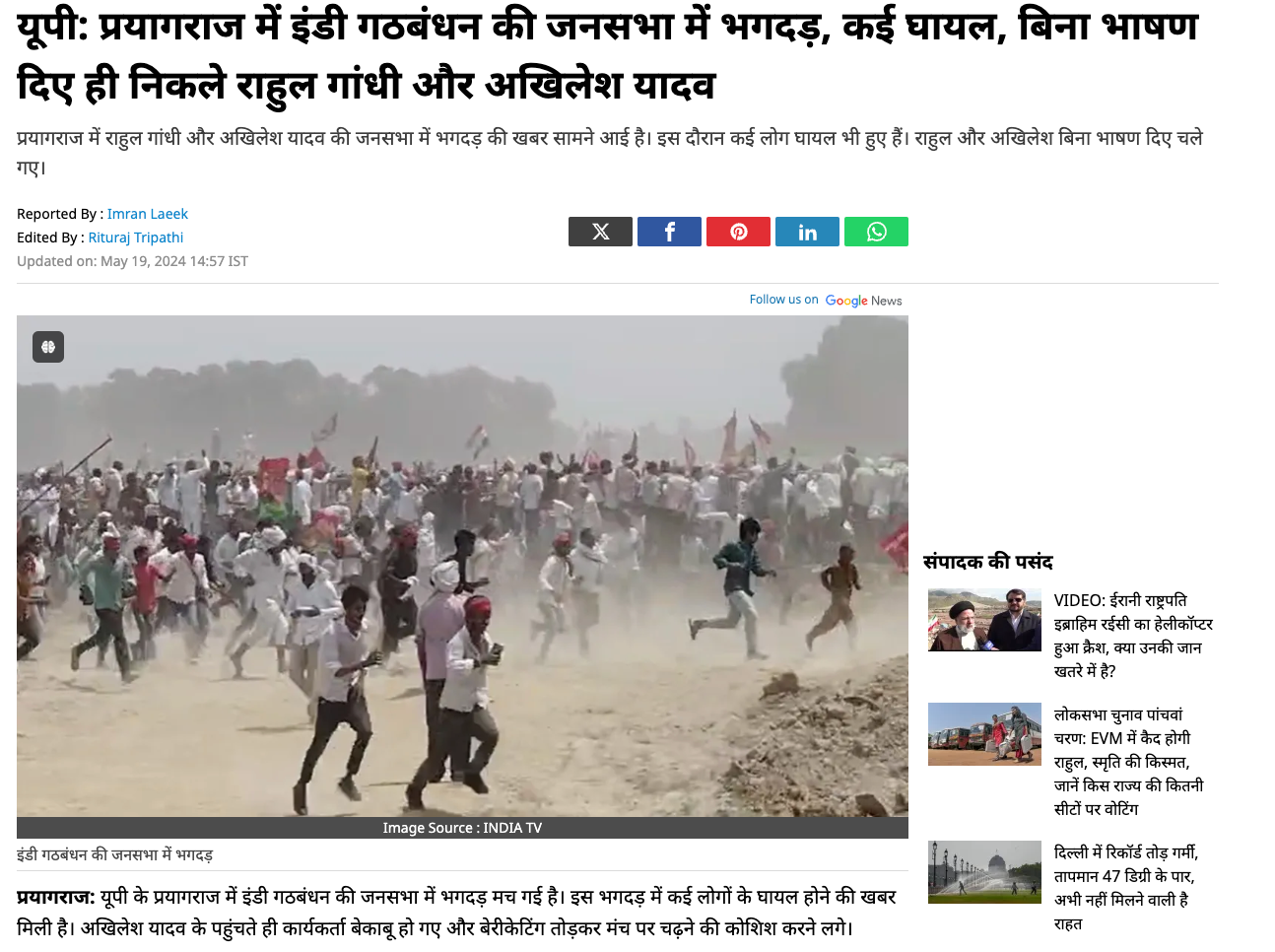 इसी घटना पर बीबीसी ने 20 मई 2024 को एक स्टोरी प्रकाशित की. रिपोर्ट में बताया गया कि प्रयागराज में 19 मई को इंडिया गठबंधन की फूलपुर और नैनी शहर में दो संयुक्त रैलियां थीं. फूलपुर में आयोजित रैली में राहुल गांधी और अखिलेश यादव को भाषण दिए बिना ही लौटना पड़ा क्योंकि रैली में मौजूद भीड़ बैरिकेडिंग तोड़कर मंच तक पहुंच गई थी.