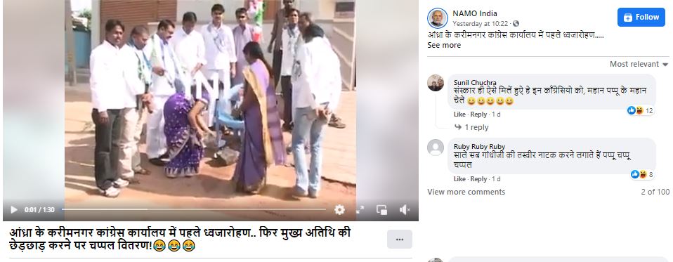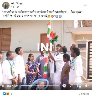 फ़ेसबुक में इस वीडियो को काफ़ी ज़्यादा शेयर किया गया है. एक यूज़र वीडियो के साथ दावा करते हैं 'आंध्रप्रदेश के करीमनगर कांग्रेस कार्यलय में पहले ध्वजारोहण...... फिर मुख्य अतिथि की छेड़छाड़ करने पर चप्पल छपाई'.
