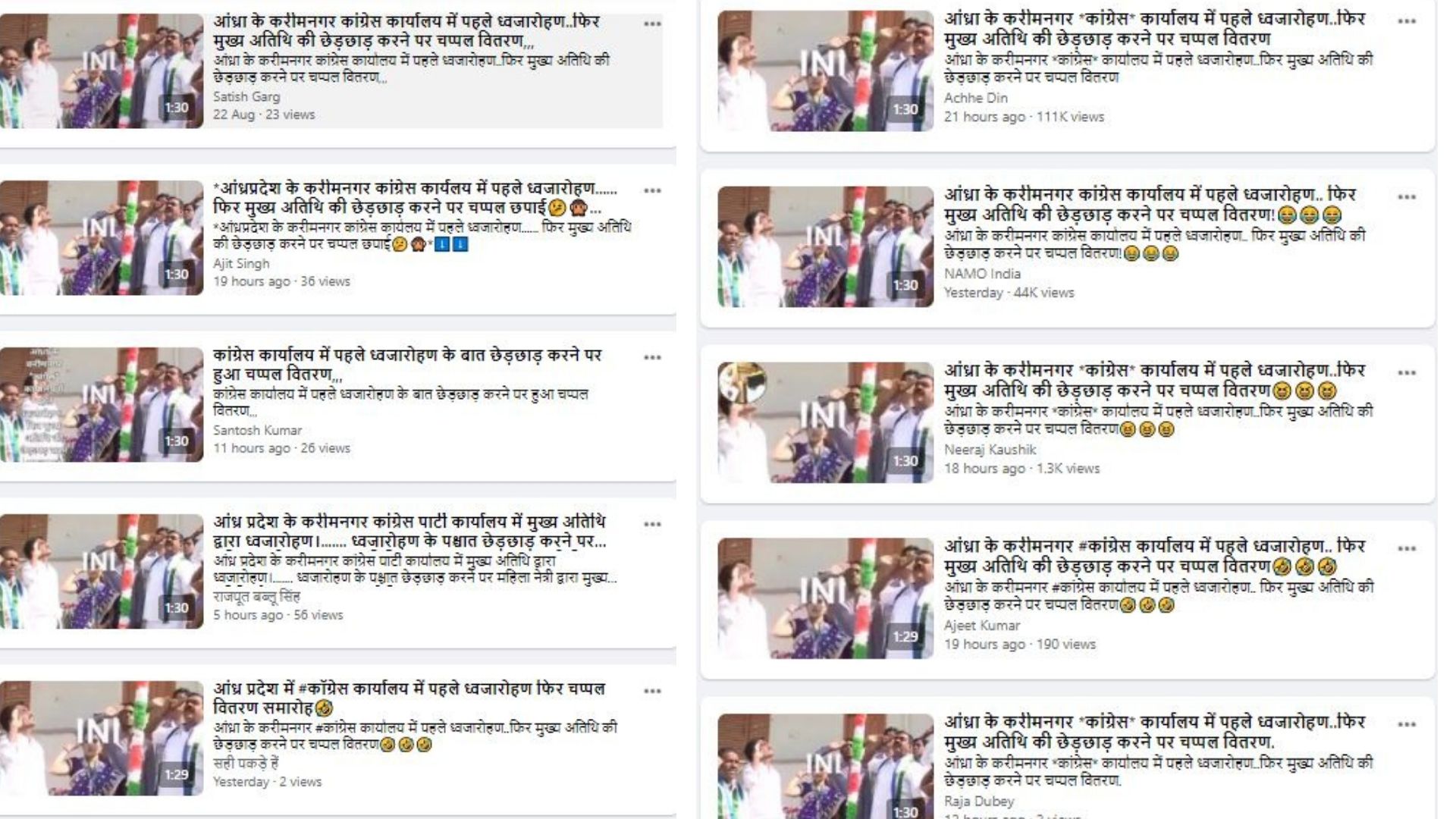 एक अन्य यूज़र ने इसी वीडियो के साथ लिखा है 'आंध्रा के करीमनगर *कांग्रेस* कार्यालय में पहले ध्वजारोहण..फिर मुख्य अतिथि की छेड़छाड़ करने पर चप्पल वितरण'.