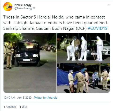 न्यूज़ एजेंसी के इस ट्वीट को क्वोट ट्वीट करते हुए डी.सी.पी नॉएडा पुलिस के ट्विटर हैंडल ने कहा: जो लोग कोरोनावायरस पॉजिटिव लोगों के संपर्क में आए थे उन्हें प्रक्रिया के मुताबिक क्वारंटाइन किया है। इसमें तबलीग़ी जमात का उल्लेख कहीं नहीं है । आप मिसक्वोट कर रहे हैं तथा फ़र्ज़ी खबर फैला रहे हैं।