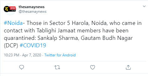 सोमवार रात को ए.एन.आई. (यू.पी) न्यूज़ ने इंग्लिश में ट्वीट किया था "सेक्टर 5 हरोला, नॉएडा के जो लोग तबलीग़ी जमात के सदस्यों के संपर्क में आए थे, उन्हें क्वारंटाइन कर दिया गया है।" ए.एन.आय. (यू.पी) ने इस बयान को गौतम बुद्ध नगर के डी.सी.पी. संकल्प शर्मा को एट्रीब्यूट किया था | ट्वीट के आर्काइव्ड वर्शन को देखने के लिए यहाँ क्लिक करें |