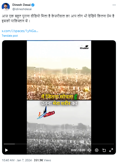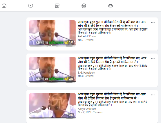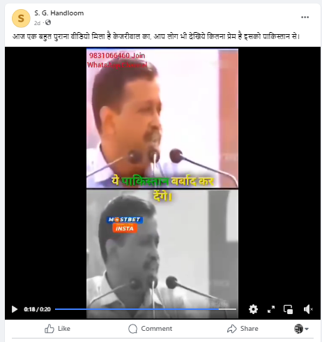 फ़ेसबुक पर एक यूज़र ने वीडियो पोस्ट करते हुए लिखा, "आज एक बहुत पुराना वीडियो मिला है केजरीवाल का, आप लोग भी देखिये कितना प्रेम है इसको पाकिस्तान से."