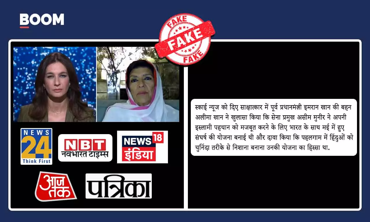 एक्स पर एक यूजर ने इस वीडियो को शेयर करते हुए लिखा, 'ब्रेकिंग: स्काई न्यूज को दिए साक्षात्कार में पूर्व प्रधानमंत्री इमरान खान की बहन अलीमा खान ने खुलासा किया कि सेना प्रमुख असीम मुनीर ने अपनी इस्लामी पहचान को मजबूत करने के लिए भारत के साथ मई में हुए संघर्ष की योजना बनाई थी और दावा किया कि पहलगाम में हिंदुओं को चुनिंदा तरीके से निशाना बनाना उनकी योजना का हिस्सा था.'