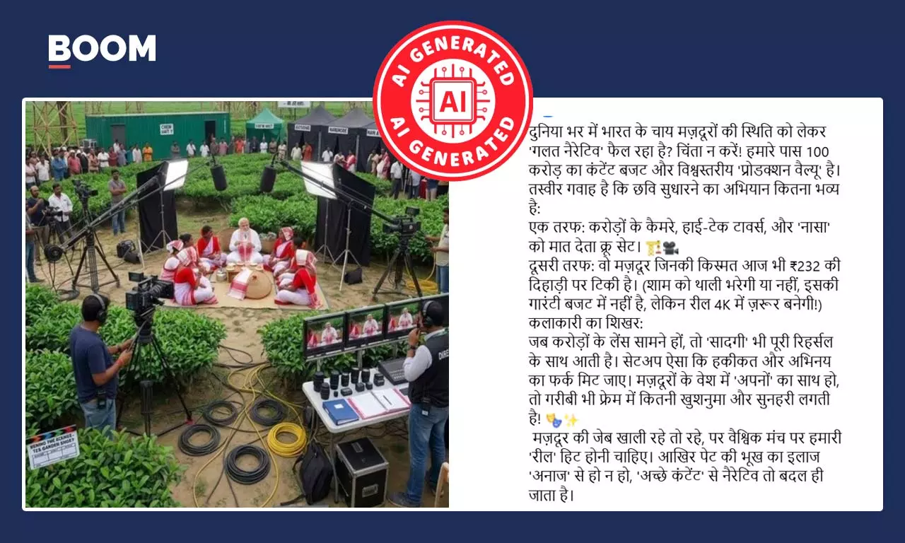 फेसबुक पर भी इस तस्वीर को शेयर करते हुए एक अन्य यूजर लिखा, 'दुनिया भर में भारत के चाय मजदूरों की स्थिति को लेकर 'गलत नैरेटिव' फैल रहा है? चिंता न करें! हमारे पास 100 करोड़ का कंटेंट बजट और विश्वस्तरीय 'प्रोडक्शन वैल्यू' है. तस्वीर गवाह है कि छवि सुधारने का अभियान कितना भव्य है- एक तरफ: करोड़ों के कैमरे, हाई-टेक टावर्स और 'नासा' को मात देता क्रू सेट. दूसरी तरफ: वो मजदूर जिनकी किस्मत आज भी ₹232 की दिहाड़ी पर टिकी है...' (आर्काइव लिंक)