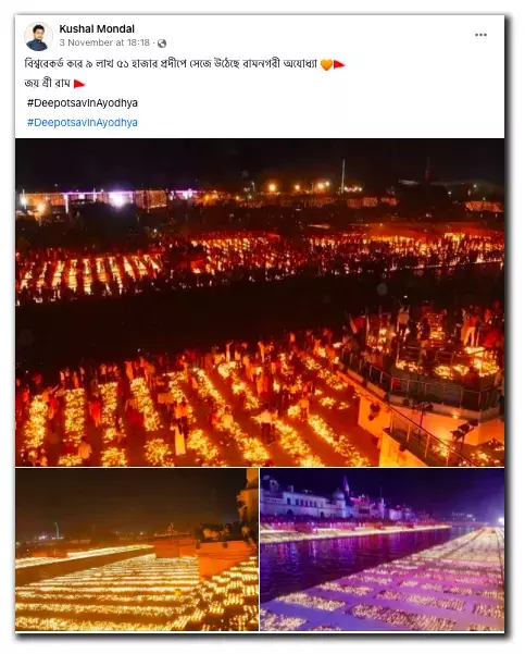 बंगाली में तस्वीरों के साथ कैप्शन का अनुवाद है, " रामनगरी अयोध्या को 9 लाख 51 हजार दीपों से सजाकर विश्व रिकॉर्ड बनाया गया है. जय श्री राम."