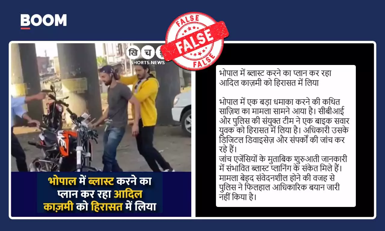 सोशल मीडिया पर एक वीडियो वायरल है जिसके साथ दावा किया जा रहा है कि सीबीआई और पुलिस की संयुक्त टीम ने भोपाल में बम ब्लास्ट की साजिश रचने वाले आदिल काजमी नाम के शख्स को हिरासत में लिया है.