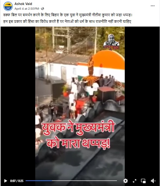 फेसबुक पर इसे शेयर करते हुए एक यूजर ने लिखा, 'वक्फ बिल पर समर्थन करने के लिए बिहार के एक युवा ने बिहार के मुख्यमंत्री नीतीश कुमार को जड़ा थप्पड़.'