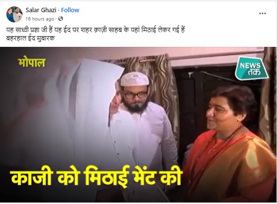 इस वीडियो को फ़ेसबुक पर वायरल दावे वाले कैप्शन के साथ काफ़ी शेयर किया गया है. कैप्शन में लिखा हुआ है, “यह साध्वी प्रज्ञा जी हैं यह ईद पर शहर क़ाज़ी साहब के यहां मिठाई लेकर गई हैं बहरहाल ईद मुबारक”.