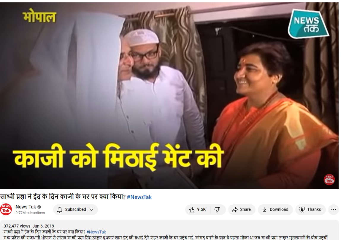 वीडियो के साथ मौजूद डिस्क्रिप्शन के अनुसार, 2019 के लोकसभा चुनाव में मिली जीत के बाद 5 जून 2019 को सांसद साध्वी प्रज्ञा ठाकुर ईद की बधाई देने शहर काजी के घर पहुंची थी.