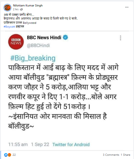 फ़ेसबुक पर एक यूज़र ने ट्वीट का स्क्रीनशॉट शेयर करते हुए लिखा,'अब तो पक्का फ्लॉप होगा....केदारनाथ और अमरनाथ आपदा के समय ये भितरे चले गए थे साले..पाकिस्तान परस्त Bollywood #Boycott ब्रह्मास्त्र'