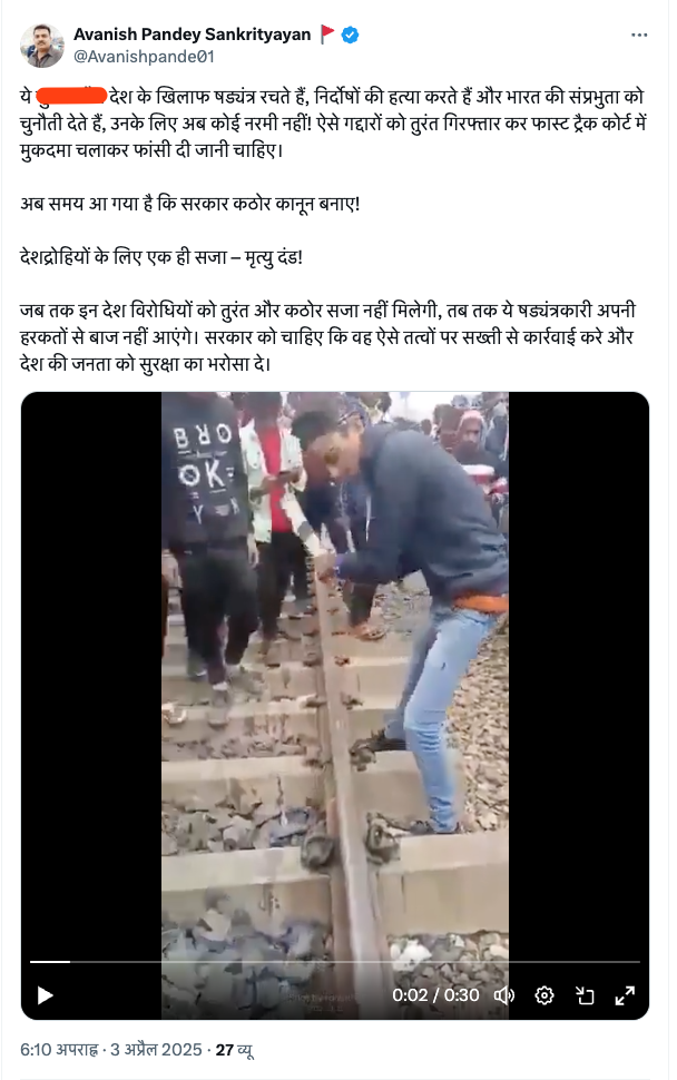 रेलवे ट्रैक को क्षतिग्रस्त करती भीड़ का एक वीडियो सोशल मीडिया पर वायरल है. यूजर एक समुदाय विशेष के लोगों को निशाना बनाते हुए सांप्रदायिक रंग देकर भ्रामक दावे से इस वीडियो को शेयर कर रहे हैं.