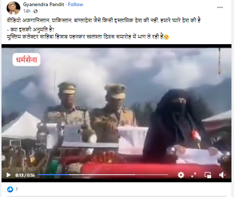 फ़ेसबुक पर एक यूज़र ने इस वीडियो शेयर करते हुए कैप्शन में लिखा है, "वीडियो अफगानिस्तान, पाकिस्तान, बांग्लादेश जैसे किसी इस्लामिक देश की नहीं, हमारे प्यारे देश की है - क्या इसकी अनुमति है?मुस्लिम कलेक्टर साहिबा हिजाब पहनकर स्वतंत्रता दिवस समारोह में भाग ले रही हैं."