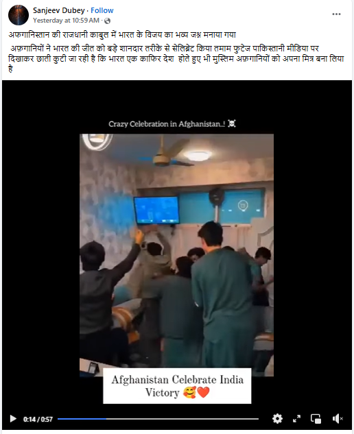 फेसबुक पर इस वीडियो को शेयर करते हुए एक यूजर ने लिखा, 'अफगानिस्तान की राजधानी काबुल में भारत के विजय का भव्य जश्न मनाया गया. अफगानियों ने भारत की जीत को बड़े शानदार तरीके से सेलिब्रेट किया. तमाम फुटेज पाकिस्तानी मीडिया पर दिखाकर छाती कूटी जा रही है कि भारत ने एक काफिर देश होते हुए भी मुस्लिम अफगानियों को अपना मित्र बना लिया है.'