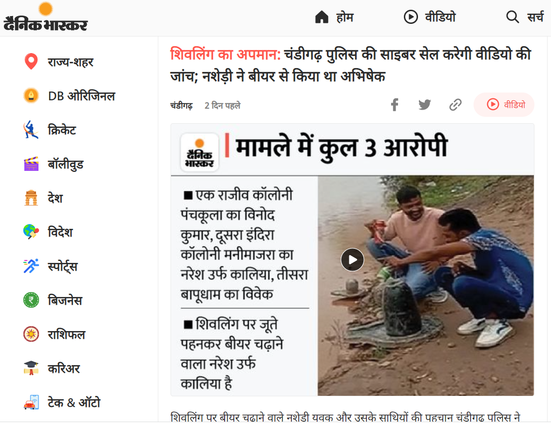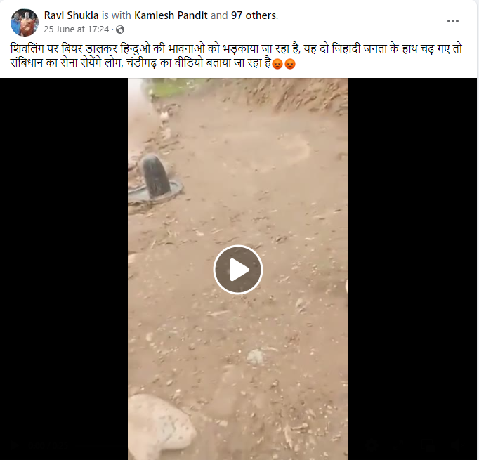 एक फ़ेसबुक यूज़र ने इस वीडियो को अपने अकाउंट से शेयर करते हुए लिखा है 'शिवलिंग पर बियर डालकर हिन्दुओ की भावनाओ को भड़काया जा रहा है, यह दो जिहादी जनता के हाथ चढ़ गए तो संबिधान का रोना रोयेंगे लोग, चंडीगढ़ का वीडियो बताया जा रहा है'.