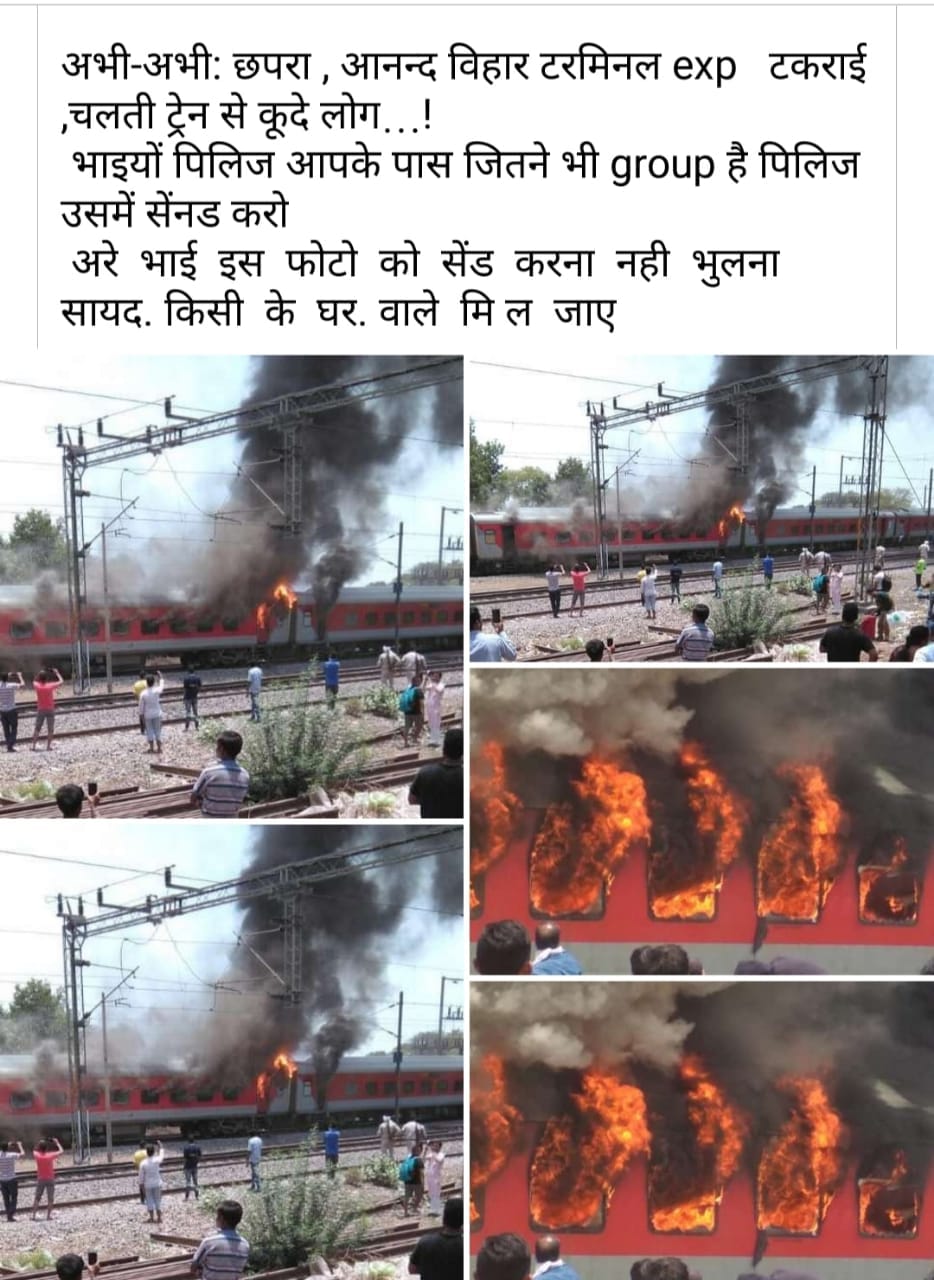 वायरल तस्वीरों के साथ कैप्शन में लिखा है, "अभी-अभी: छपरा , आनन्द विहार टरमिनल exp टकराई ,चलती ट्रेन से कूदे लोग…!भाइयों पिलिज आपके पास जितने भी group है पिलिज उसमें सेंनड करो. अरे भाई इस फोटो को सेंड करना नही भुलना सायद. किसी के घर. वाले मिल जाए".