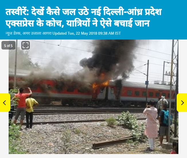 न्यूज़ वेबसाइट अमर उजाला पर प्रकाशित 22 मई 2018 की एक रिपोर्ट में हमें यह तस्वीर मिली. रिपोर्ट में बताया गया कि ट्रेन की बोगियों में आग लगने की यह घटना नई दिल्ली-आंध्रप्रदेश एक्सप्रेस की है.