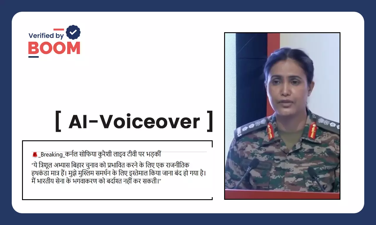 बूम ने जांच में पाया कि यह दावा झूठा है. वीडियो में एक फर्जी वॉइस ओवर जोड़ा गया है. मूल वीडियो भारतीय सेना द्वारा आयोजित ‘चाणक्य डिफेंस डायलॉग’ में 31 अक्टूबर 2025 को दिए एक संबोधन का है. इस संबोधन में कर्नल सोफिया कुरैशी ने ऐसा कोई बयान नहीं दिया था.