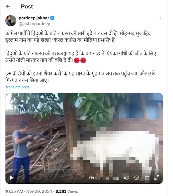 वायरल वीडियो को शेयर करते हुए एक्स पर एक यूजर ने लिखा, 'कांग्रेस पार्टी ने हिंदुओं के प्रति नफरत की सारी हदें पार कर दी हैं. मोहम्मद मुजाहिद इस्लाम नाम का यह शख्स "केरल कांग्रेस का मीडिया प्रभारी" है. हिंदुओं के प्रति नफरत की पराकाष्ठा यह है कि वायनाड में प्रियंका गांधी की जीत के लिए उसने गोली मारकर गाय की बलि दे दी.😡😡 इस वीडियो को इतना शेयर करो कि यह भारत के गृह मंत्रालय तक पहुंच जाए और उसे गिरफ्तार कर लिया जाए.'