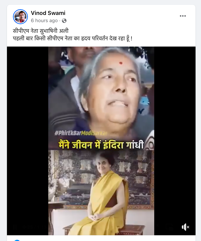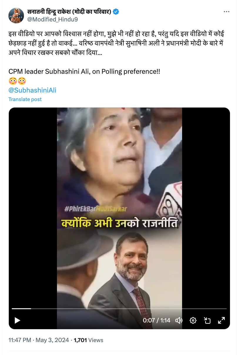 एक एक्स यूजर ने सुभाषिनी अली को टैग करते हुए वीडियो के साथ कैप्शन में लिखा, 'इस वीडियो पर आपको विश्वास नहीं होगा, मुझे भी नहीं हो रहा है, परंतु यदि इस वीडियो में कोई छेड़छाड़ नहीं हुई है तो वाकई... वरिष्ठ वामपंथी नेत्री सुभाषिनी अली ने प्रधानमंत्री मोदी के बारे में अपने विचार रखकर सबको चौंका दिया.'