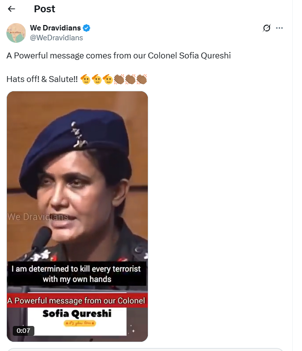 सोशल मीडिया प्लेटफॉर्म एक्स पर एक यूजर ने वीडियो शेयर करते हुए इसे कर्नल सोफिया कुरैशी की ओर से एक शक्तिशाली संदेश बताया. (आर्काइव लिंक)