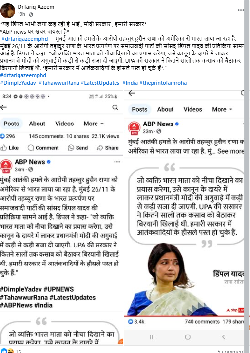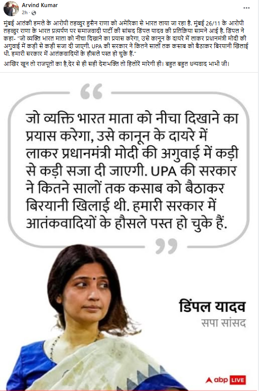 एक अन्य फेसबुक यूजर ने इस बयान को कोट करते हुए दावा किया, 'मुंबई आतंकी हमले के आरोपी तहव्वुर हुसैन राणा को अमेरिका से भारत लाया जा रहा है. मुंबई 26/11 के आरोपी तहव्वुर राणा के भारत प्रत्यर्पण पर समाजवादी पार्टी की सांसद डिंपल यादव की प्रतिक्रिया सामने आई है.'