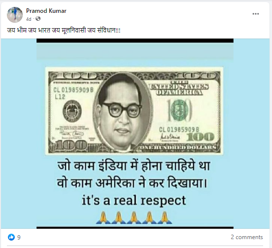 सोशल मीडिया पर सौ डॉलर का अमेरिकी नोट (करेंसी) जिसपर डॉ. भीमराव आंबेडकर की तस्वीर छपी है, खूब वायरल है. तस्वीर को असल मानकर शेयर करते हुए सोशल मीडिया यूज़र्स कह रहे है कि नोट पर आंबेडकर की तस्वीर छापने का काम भारत नहीं कर पाया लेकिन अमेरिका ने कर दिखाया.