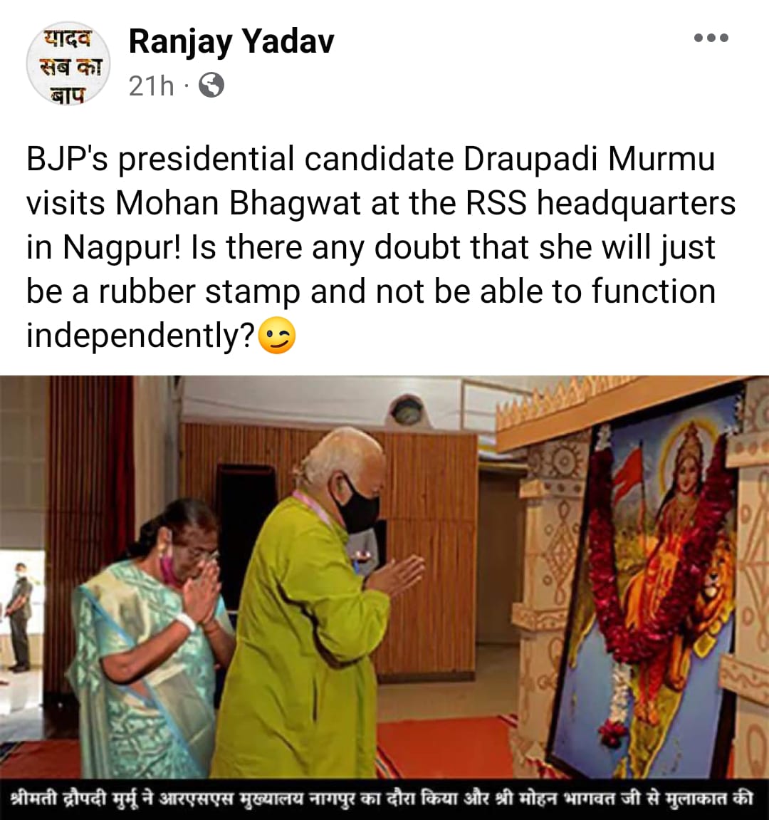 (BJP's presidential candidate Draupadi Murmu visits Mohan Bhagwat at the RSS headquarters in Nagpur! Is there any doubt that she will just be a rubber stamp and not be able to function independently?)