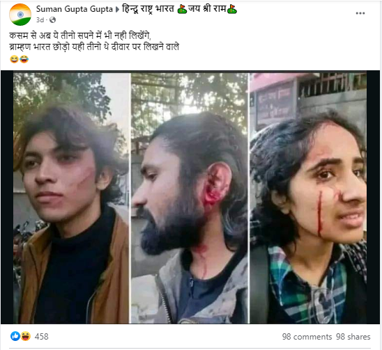 सोशल मीडिया पर एक कोलाज बहुत अधिक वायरल है जिसमें तीन लोगों की तस्वीरें दिख रही हैं. कोलाज में दिख रहे तीनों लोग लहूलुहान और उनके चेहरे पर चोटों के निशान दिख रहे हैं. कोलाज के साथ दावा किया जा रहा है कि ये लोग वही हैं जिन्होंने जवाहर लाल विश्वविद्यालय (जेएनयू) की दीवारों पर 'ब्राह्मण भारत छोड़ो' के नारे लिखे थे, इसीलिए लोगों ने इनका ये हाल कर दिया है.