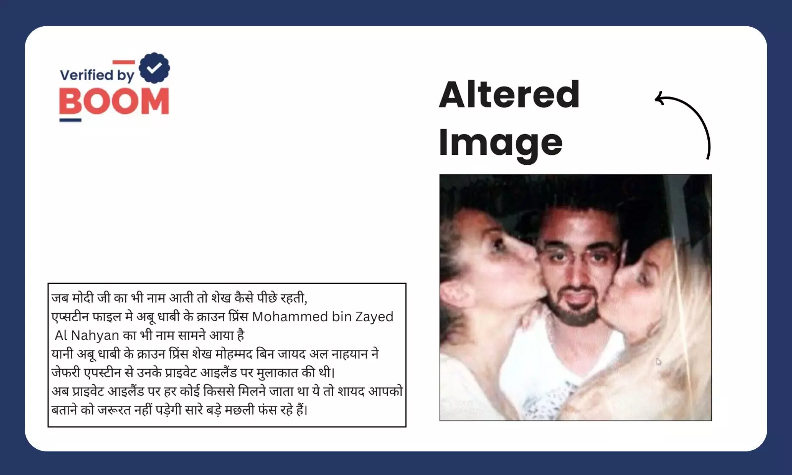 एक्स और फेसबुक जैसे माध्यमों पर मोहम्मद बिन जायद की एक अन्य तस्वीर के साथ यह एडिटेड शेयर की जा रही है. इस तस्वीर में मोहम्मद बिन जायद दो महिलाओं के साथ आपत्तिजनक स्थिति में नजर आ आ रहे हैं.