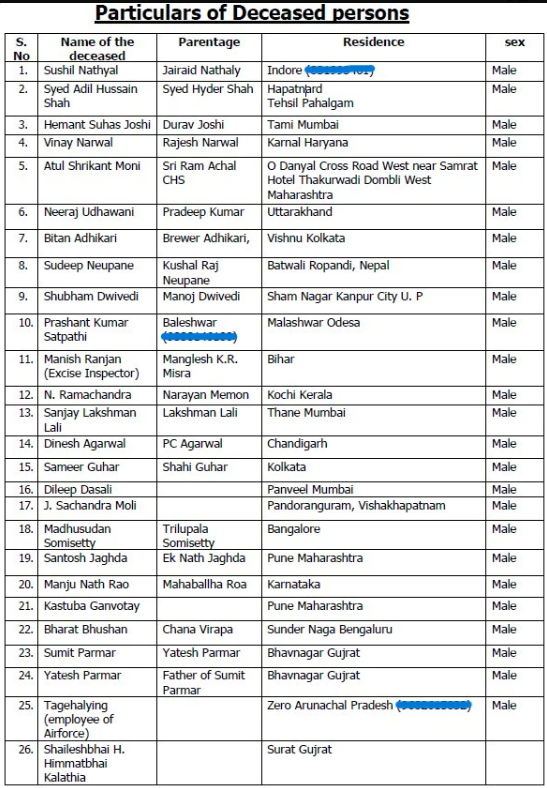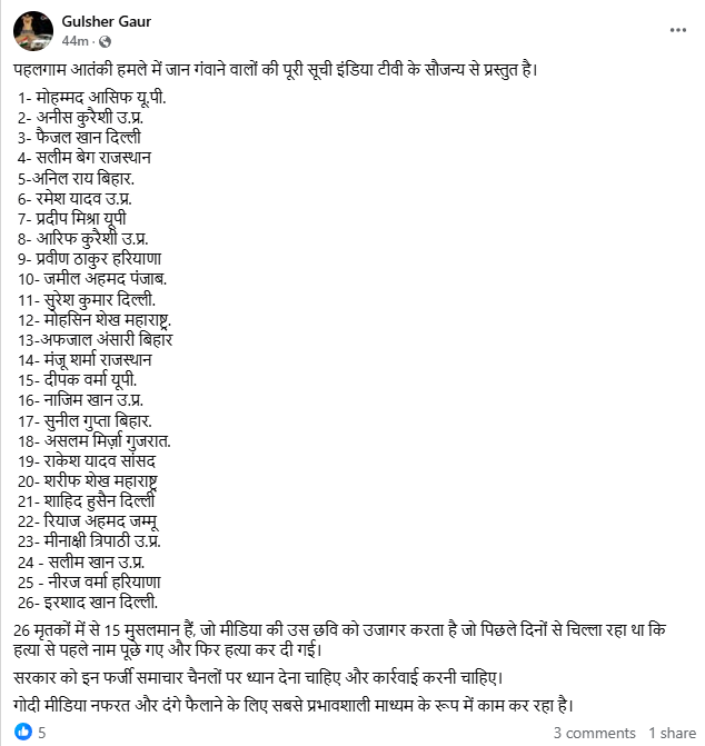 एक फेसबुक यूजर ने इस सूची को शेयर करते हुए लिखा है, पहलगाम आतंकी हमले में जान गंवाने वालों की पूरी सूची इंडिया टीवी के सौजन्य से प्रस्तुत है...