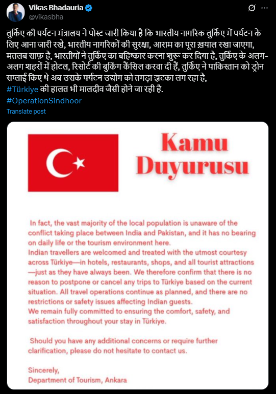 एक्स यूजर विकास भदौरिया ने पत्र को शेयर करते हुए लिखा है, "तुर्की के पर्यटन मंत्रालय ने पोस्ट जारी किया है कि भारतीय नागरिक तुर्की में पर्यटन के लिए आना जारी रखें, भारतीय नागरिकों की सुरक्षा, आराम का पूरा ख्याल रखा जाएगा, मतलब साफ़ है, भारतीयों ने तुर्की का बहिष्कार करना शुरू कर दिया है, तुर्की के अलग-अलग शहरों में होटल, रिजॉर्ट की बुकिंग कैंसिल करवा दी हैं, तुर्की ने पाकिस्तान को ड्रोन सप्लाई किए थे अब उसके पर्यटन उद्योग को तगड़ा झटका लग रहा है."