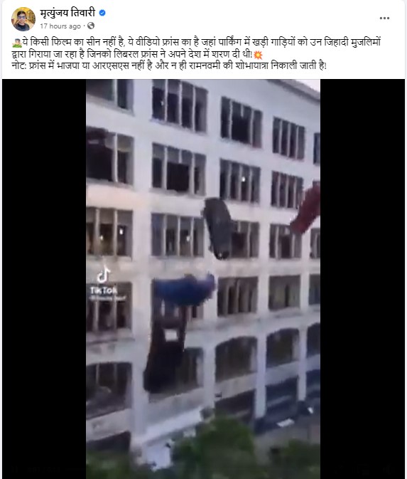 क़रीब 13 सेकेंड के इस वीडियो को फ़ेसबुक पर वायरल दावे कैप्शन के साथ शेयर किया गया है. कैप्शन में लिखा हुआ है, “ये किसी फिल्म का सीन नहीं है, ये वीडियो फ्रांस का है जहां पार्किंग में खड़ी गाड़ियों को उन जिहादी मुजलिमों द्वारा गिराया जा रहा है जिनको लिबरल फ्रांस ने अपने देश में शरण दी थी! नोट: फ्रांस में भाजपा या आरएसएस नहीं है और न ही रामनवमी की शोभायात्रा निकाली जाती है!”