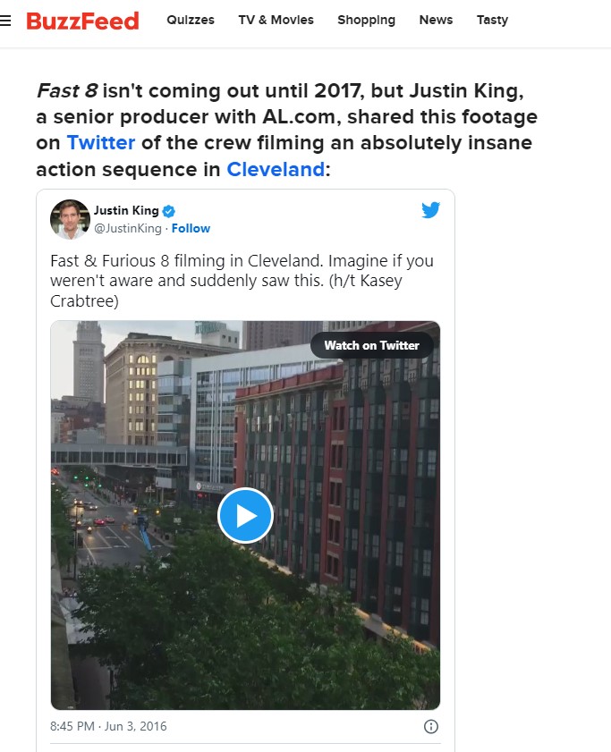 क़रीब 12 सेकेंड के वीडियो के शुरूआती हिस्से में ही वायरल वीडियो वाले दृश्य मौजूद थे. आगे के हिस्से में कारों के गिरने के बाद सड़क पर ब्लास्ट और उसके बीच से गाड़ियों के गुजरने वाले दृश्य मौजूद थे. वीडियो को शेयर करते हुए जस्टिन किंग नाम के वेरिफ़ाईड ट्विटर यूज़र ने इसे ‘फास्ट एंड फ्यूरियस 8’ की शूटिंग का दृश्य बताया था. साथ ही उन्होंने कैप्शन में यह भी बताया था कि यह शूटिंग क्लीवलैंड में हुई है.