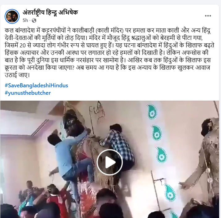 सोशल मीडिया पर एक वीडियो सांप्रदायिक दावे के साथ वायरल है जिसमें कुछ लोगों को मां काली की प्रतिमा को तोड़ते हुए देखा जा सकता है. यूजर्स इस वीडियो को शेयर करते हुए दावा कर रहे हैं कि वायरल वीडियो बांग्लादेश का है जहां कट्टरपंथियों ने कालीबाड़ी मंदिर पर हमला कर देवी-देवताओं की मूर्ति के साथ तोड़-फोड़ की.