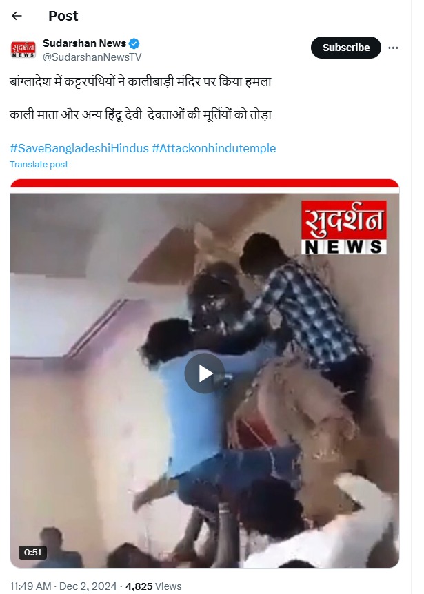 सोशल मीडिया प्लेटफॉर्म एक्स पर वायरल वीडियो को शेयर करते हुए दक्षिणपंथी न्यूज चैनल Sudarshan News ने लिखा, 'बांग्लादेश में कट्टरपंथियों ने कालीबाड़ी मंदिर पर किया हमला, काली माता और अन्य हिंदू देवी-देवताओं की मूर्तियों को तोड़ा.' (पोस्ट का आर्काइव लिंक)