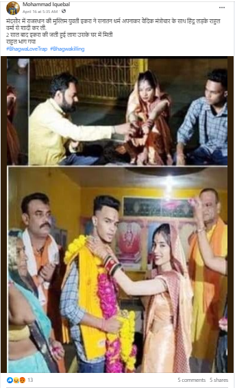 फेसबुक पर एक यूज़र ने कोलाज शेयर करते हुए लिखा, "मंदसौर में राजस्थान की मुस्लिम युवती इकरा ने सनातन धर्म अपनाकर वैदिक मंत्रोचार के साथ हिंदू लड़के राहुल वर्मा से शादी कर ली. 2 साल बाद इकरा की जली हुई लाश उसके घर में मिली राहुल भाग गया."