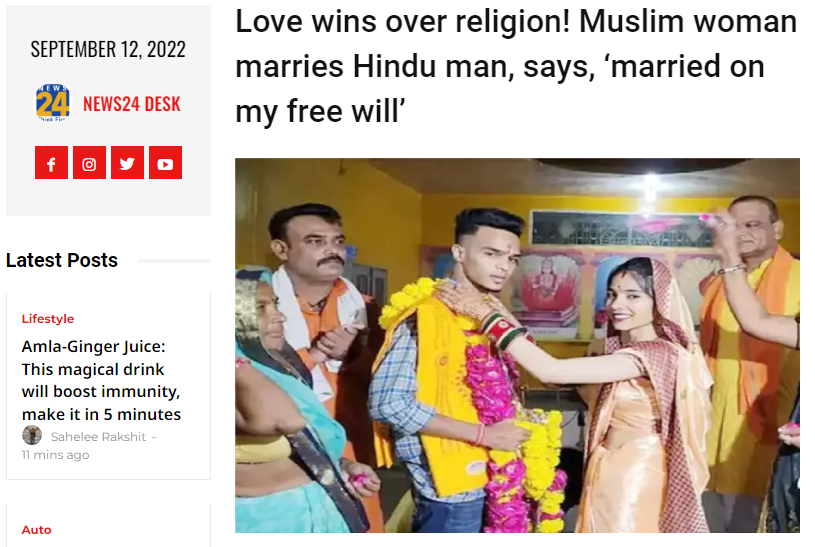 बूम ने सबसे पहले वायरल तस्वीर को गूगल रिवर्स इमेज सर्च किया तो न्यूज़24 की 12 सितम्बर 2022 की रिपोर्ट मिली. रिपोर्ट के मुताबिक, 'मध्य प्रदेश के मंदसौर में, राजस्थान के जोधपुर की एक मुस्लिम लड़की इकरा ने सनातन धर्म अपनाकर हिंदू लड़के राहुल वर्मा से वैदिक मंत्रोच्चार के साथ शादी कर ली. इकरा ने शादी से पहले हिंदू धर्म अपना लिया था. इकरा अब इशिका के नाम से जानी जाएगी. मंदसौर के गायत्री परिवार मंदिर में दोनों ने वैदिक रीति-रिवाजों से शादी की.
