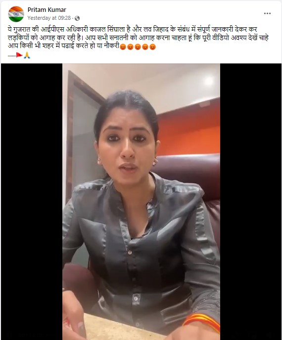 वीडियो को फ़ेसबुक पर लंबे कैप्शन के साथ शेयर किया जा रहा है, जिसमें लिखा हुआ है “ये गुजरात की आईपीएस महिला अधिकारी काजल सिंघाला है और लव जिहाद की बखिया उधेड़ कर लड़कियों को आगाह कर रही है। हिन्दू धर्म के लोगों को आगह करना चाहता हूं। अपने परिवार की लड़कियों को तुरंत यह विडियो भेज दो। किसी भी शहर में पढाई करती है या नोकरी करती हो”.