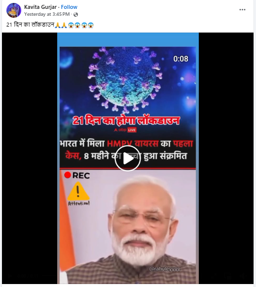 ह्यूमन मेटान्यूमोवायरस (HMPV) संक्रमण के बढ़ते मामलों के बीच सोशल मीडिया पर प्रधानमंत्री नरेंद्र मोदी का एक वीडियो वायरल है, जिसमें वह देश में 21 दिन के लॉकडाउन की घोषणा करते नजर आ रहे हैं.