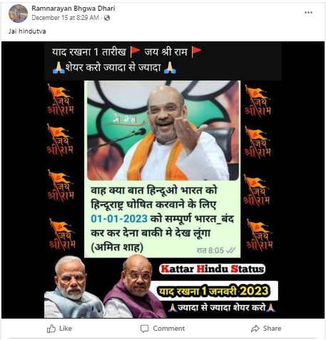 सोशल मीडिया पर गृह मंत्री अमित शाह की तस्वीर के साथ दावा करते हुए कहा जा रहा है कि उन्होंने देश के हिन्दुओं से अपील की है कि हिन्दू राष्ट्र बनाने के लिए एक जनवरी 2023 को पूरा भारत बंद करवा दो बाकी मैं देख लूंगा. यूज़र्स इसे सच मानते हुए बड़ी संख्या में शेयर कर रहे हैं.