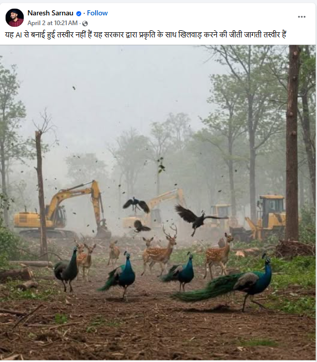 ऐसी ही एक तस्वीर सोशल मीडिया पर खूब छाई है, जिसमें बुलडोजर से जंगल कटाई के बीच मोर और हिरण जान बचाकर भगाते नजर आ रहे हैं.