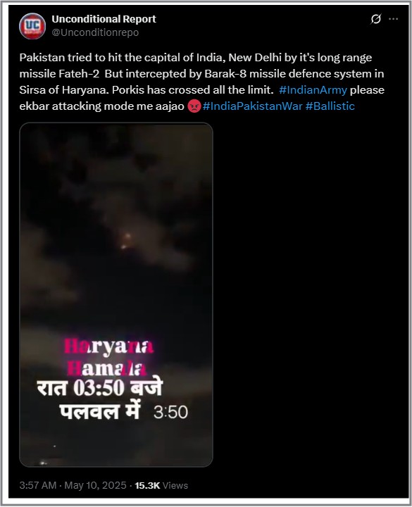 एक्स पर इसे शेयर करते हुए एक यूजर ने अंग्रेजी कैप्शन में लिखा, 'पाकिस्तान ने भारत की राजधानी दिल्ली पर लंबी दूरी की फतह-2 मिसाइल से हमला करने की कोशिश की, लेकिन हरियाणा के सिरसा में बराक-8 मिसाइल डिफेंस सिस्टम ने उसे रोक दिया.'